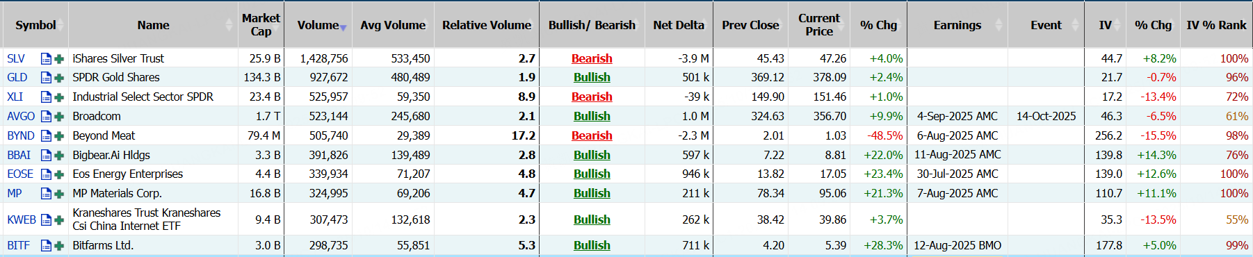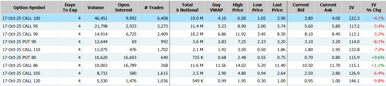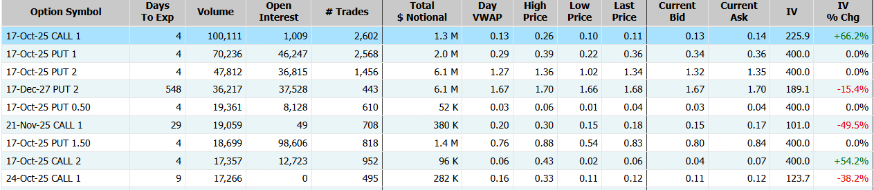 「人造肉第一股」Beyond Meat隔夜暴跌超48%,期權合約成交50.69萬張,較90日均量放大17.2倍。10月17日到期的1美元的行權看漲期權交易量特別高,共有100,111份合約交易。 $BYND 20251017 1.0 CALL$