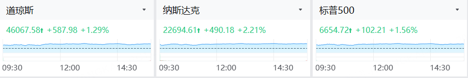截至收盤,道指漲587.98點,漲幅為1.29%,報46067.58點;納指漲490.178點,漲幅為2.21%,報22694.608點;標普500指數漲102.21點,漲幅為1.56%,報6654.72點。
