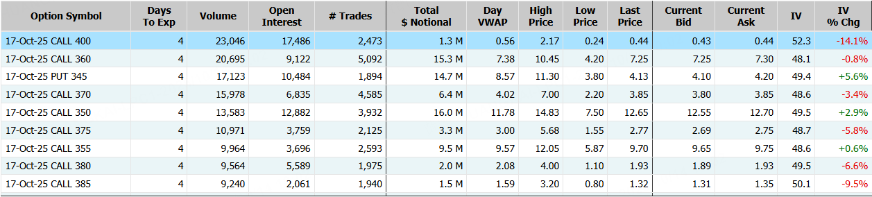 博通隔夜漲近10%,期權合約成交52.43萬張,較90日均量放大2.1倍。10月17日到期的400美元的行權看漲期權交易量特別高,共有23,046份合約交易。 $AVGO 20251017 400.0 CALL$