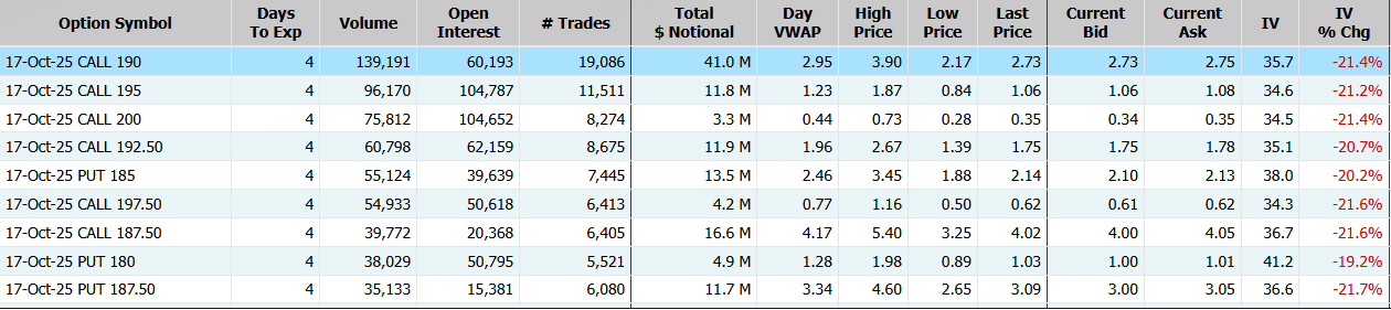 英偉達隔夜漲近3%,期權合約成交184.16萬張。10月17日到期的190美元的行權看漲期權交易量特別高,共有139,191份合約交易。 $NVDA 20251017 190.0 CALL$