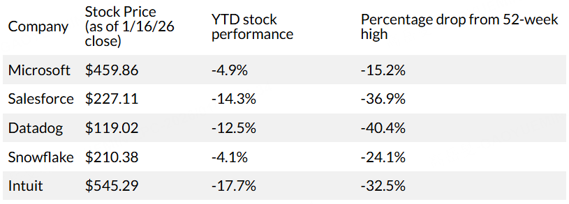 D.A.Davidson分析師GilLuria認為,當前是選擇性增持軟件股的合適時點。他看好 微軟 、 Snowflake 和Datadog 等公司,認為2026年將成為其營收增長並逐步打破市場對人工智能過度擔憂的關鍵一年。Luria在最新報告中指出,軟件行業的商業模式並未發生實質性變化,這些公司依然具備高利潤率和強可擴展性的特徵,只是「人工智能將取代軟件」的敘事取代了營收增長,成為當前市場的主要估值驅動因素。華爾街普遍預計,Datadog和Snowflake未來一年的營收增速仍將超過20%。