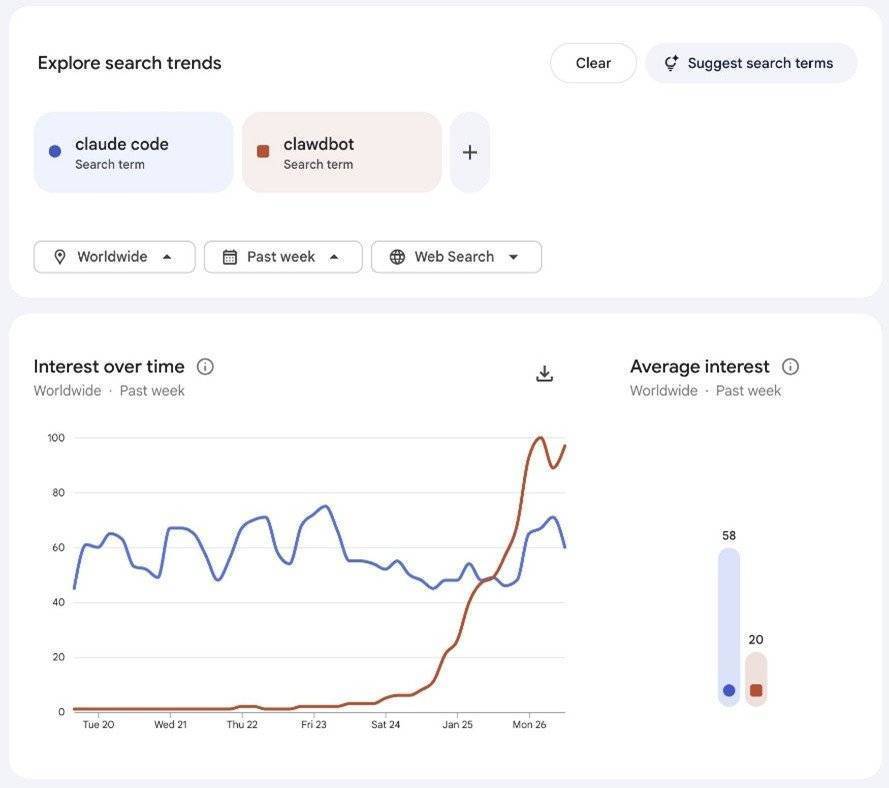 截止目前,Clawdbot(Moltbot)在Github的星數已經超過6萬,收藏數超過7200。而對比Clawdbot(Moltbot)與Claude Code的谷歌數據可以發現,過去三四天裏前者的搜索指數急速攀升,目前已經大幅度超過Anthropic旗下的終端AI編程助手Claude Code。