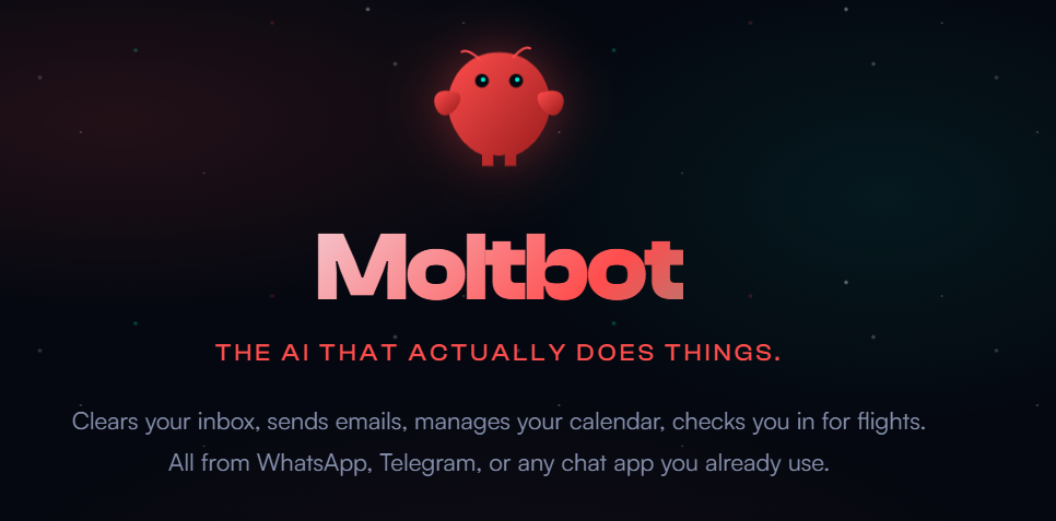 在項目官網上,開發者在Moltbot的名字下方用一句話概括了其定位:一款真正做事的AI(The AI that actually does things)。