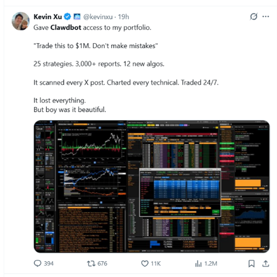 在X上,用戶Kevin Xu讓Moltbot 幫忙炒股,要求它t「把這筆資金交易到 100 萬美元」,隨後,Moltbot制定了25套交易策略,生成 3000 多份分析報告,編寫 12 個全新算法,然後開始了全天候的不間斷的股票交易。雖然Moltbot最後把錢賠光了,但Kevin 認為這個自動交易的過程「帥炸了」。