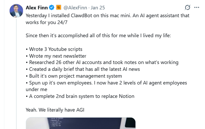 上周末,全硅谷都在為Clawdbot(新名字為Moltbot)而瘋狂。無論Reddit、X還是Hacker News 這樣的極客社區,人們紛紛分享着安裝教程,應用體驗,並紛紛發出驚歎。一位科技創業者Alex Finn將其稱為「迄今為止最偉大的 AI 應用」,也有很多人說它就像一個能24小時待命的賈維斯(《鋼鐵俠》中的AI系統)。