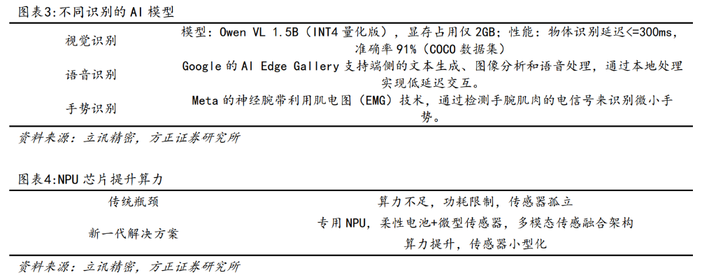 過去 AI 眼鏡發展受限於技術,目前技術突破 AI 眼鏡快速發展。預計 2025 年 AI 眼鏡行業出貨量超 1000 萬副,Meta 數量 500 萬副。該量主要因為技術進步。第一,端側中小模型普及,適配低算力和高隱私場景。過去兩年,採用強化學習和知識蒸餾的技術,使得小型模型展現出顯著的能力提升,它們支持語音識別、實時翻譯、文檔摘要等功能,實現本地 AI 的部署和應用。第二,可穿戴設備芯片算力提升,垂類小模型實現自然交互。