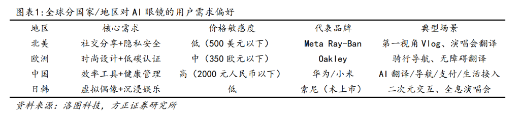 AI 眼鏡存在需求,在全球主要消費地區受環境、人文影響,消費傾向差異明顯。成熟消費市場追求「情感價值化」,比如 Meta 用戶為自拍買單;發展中市場需求「生產力與工具化」,中國用戶為效率付費。