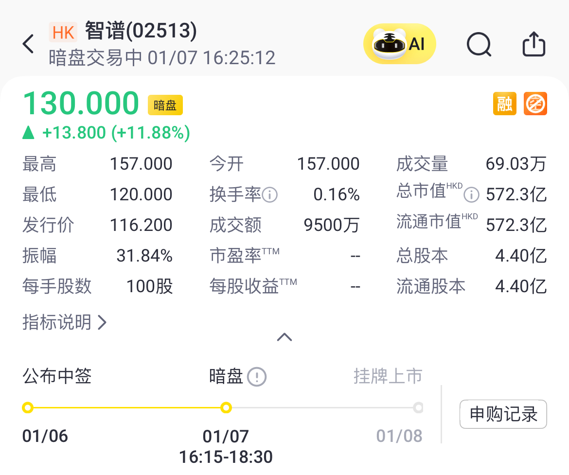 「AI六小虎」之一的AI大模型開發商 智譜 (02513)暗盤大漲超11%,不計手續費,一手賬面賺1380港元。