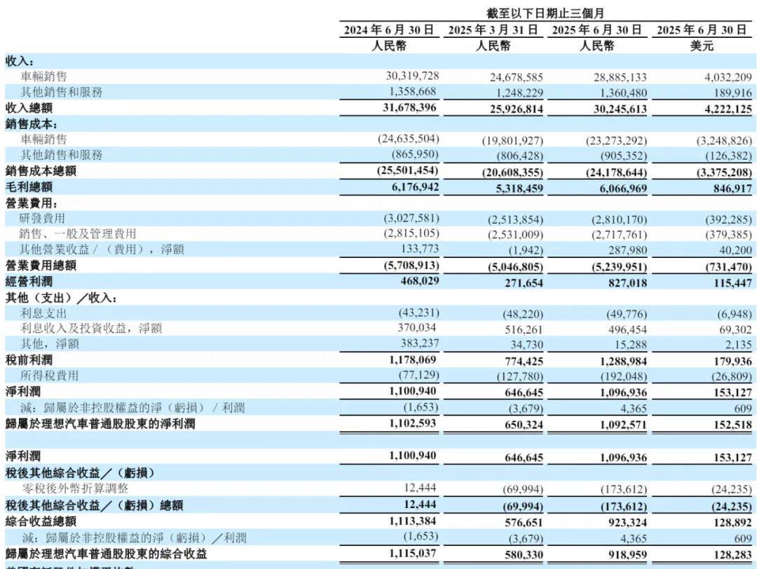 理想汽車二季度營收302億元,車輛銷售收入為289億元。二季度經營利潤達到8.27億元,淨利潤11億元。二季度汽車總交付量為111,074輛,同比增長2.3%。