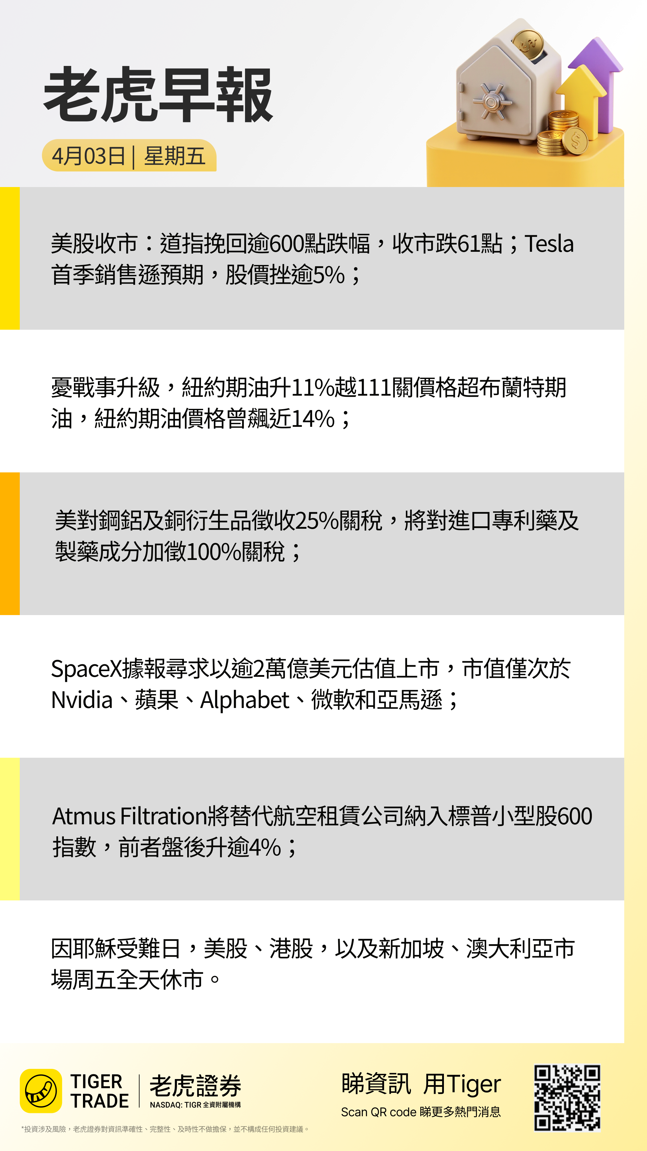特斯拉 大跌5.42%。一季度全球交付量為358,023輛,低於彭博彙編分析師平均預期的372,160輛,為近年來表現最疲弱的季度之一。一季度,特斯拉Model 3/Y合計交付341,893輛,按年增長約5.6%,同樣低於市場平均預期的353,928輛。