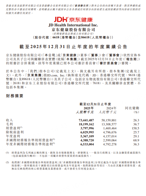 京東健康2025年收入達到人民幣734億元,按年增長26.3%,非國際財務報告準則盈利達人民幣65億元,按年增長達36.3%,淨利潤率達到8.9%。收入連續四個季度按年增速超20%,25年非國際財務報告準則淨利潤率達到公司成立以來最高水平。