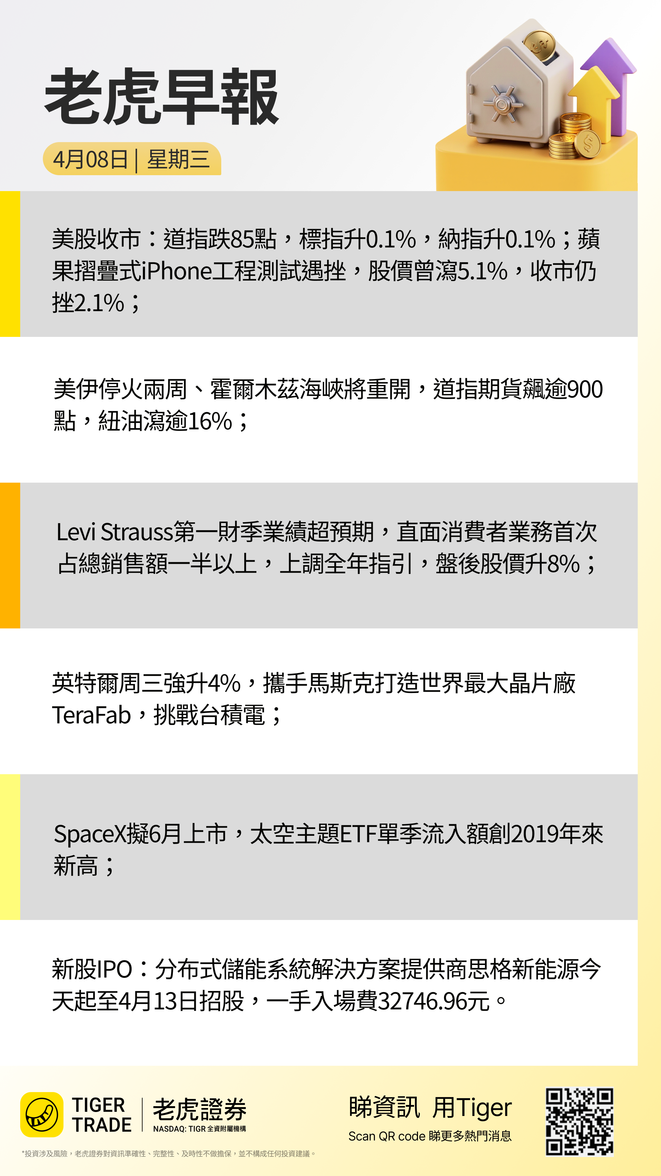 4月8日,美股三大指數升跌不一,截至收盤,道瓊斯指數跌0.18%報46 584.46點,受能源與防禦股分化拖累;標普500指數微漲0.08%至6 616.85點;納斯達克綜合指數漲0.10%收報22 017.85點,成長股韌性對沖了權重科技股的分化。整體來看,地緣局勢牽動情緒,指數高位震盪。