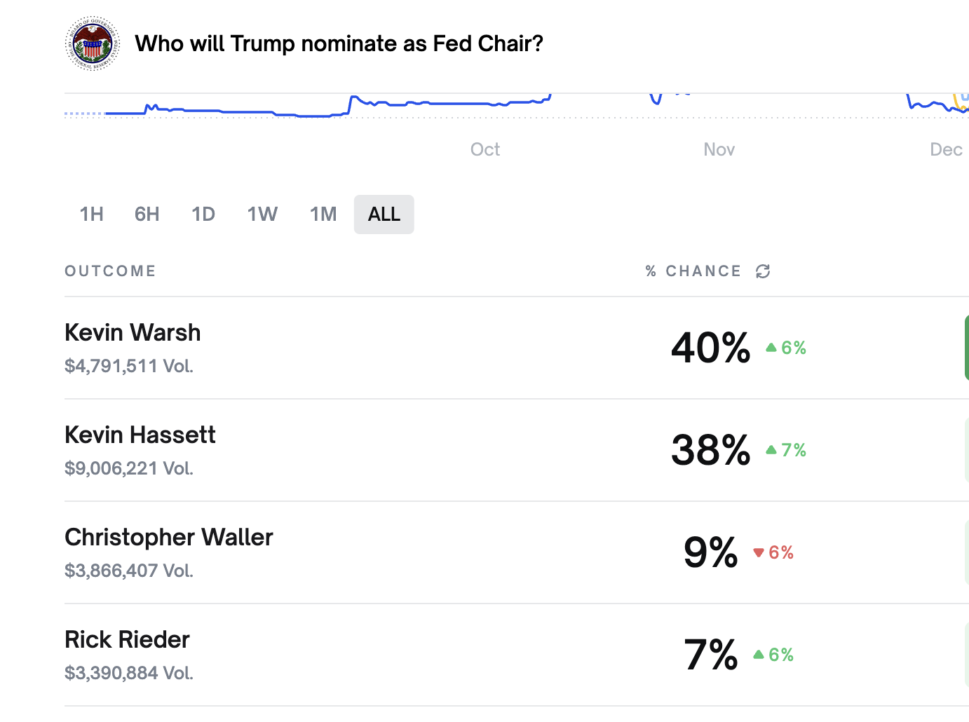 截止發文,Polymarket 數據顯示,Kevin Warsh 當選聯儲局主席的概率暫報 40%(上漲 6%),Kevin Hassett 當選聯儲局主席的概率暫報 38%(上漲 7%),Christopher Waller 當選聯儲局主席的概率暫報 9%(下跌 9%),Rick Rieder 當選聯儲局主席的概率最低、暫報 7%(上漲 6%)。雖然與 Warsh 和 Hassett 的勝率相比較低,但至少上漲了 6 個點,馬上就可以把 Waller 斬於馬下。