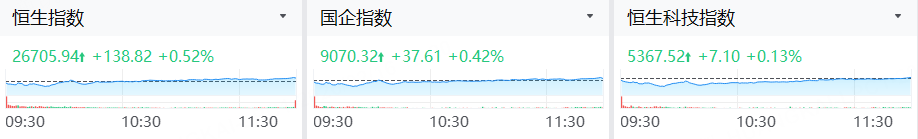 今日港股三大指數齊漲,恒指漲0.52%,科指漲0.13%,國指漲0.42%。