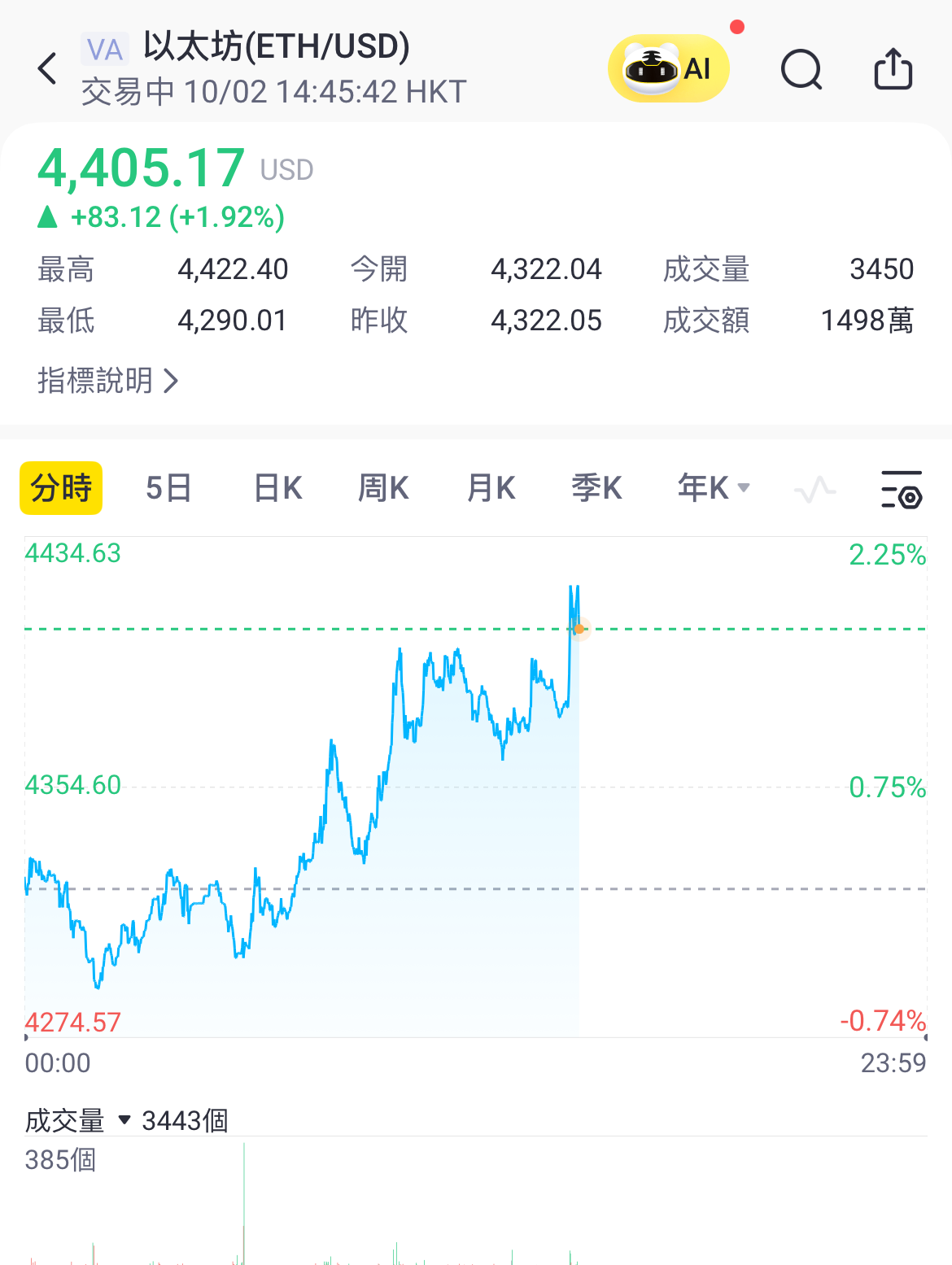 以太坊拉昇,站上4400美元關口;美股以太幣財庫公司夜盤上揚,BMNR( BitMine Immersion Technologies Inc. )漲逾3%,BTBT( Bit Digital, Inc. )、SBET( SharpLink Gaming )漲逾2%。