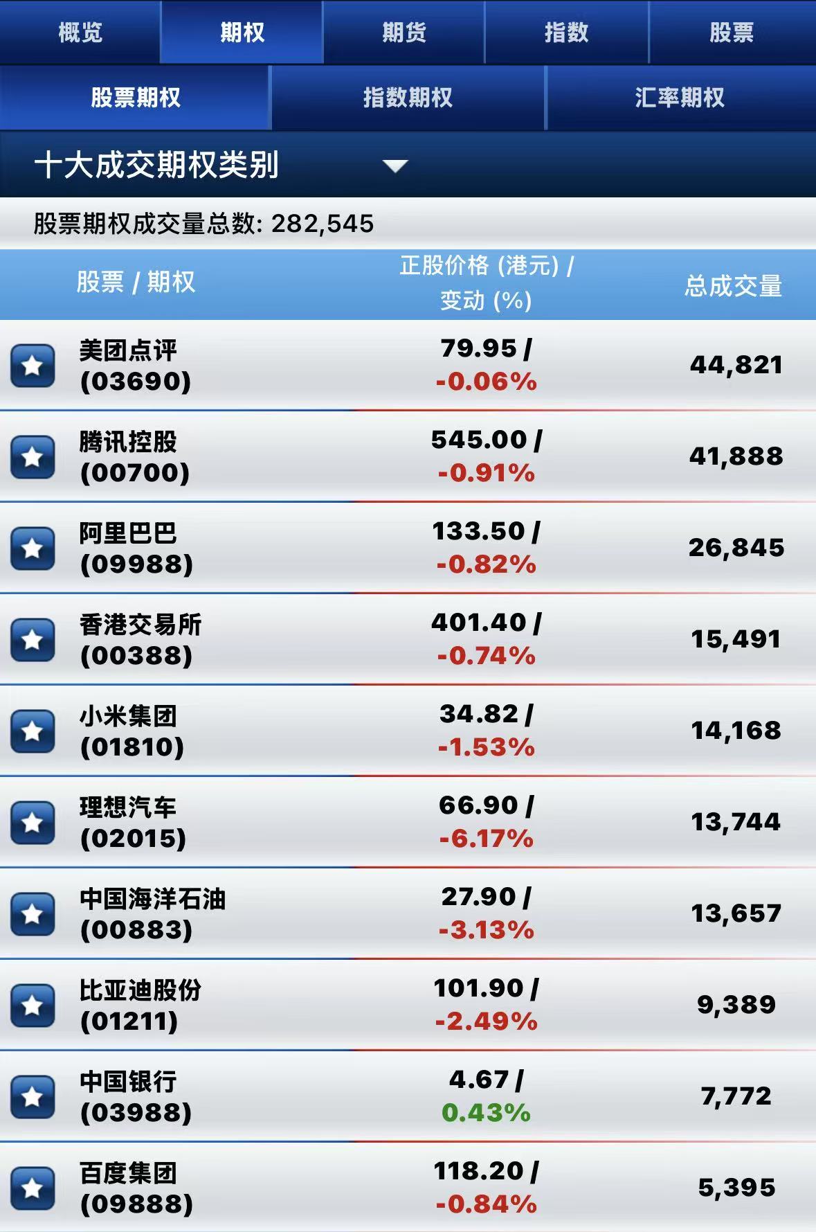 港股期權半日成交超28萬張。其中,美團-W成交量居前,期權成交近4.5萬張;騰訊控股名列次席,期權成交近4.2萬張;阿里巴巴-W位居第三,期權成交超2.6萬張。