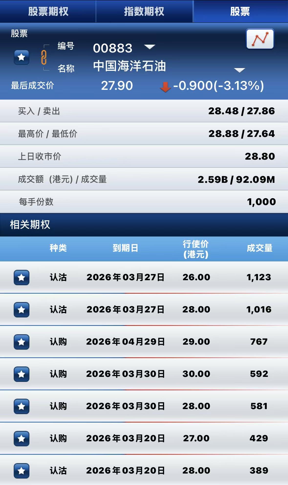 中國海洋石油跌超3%,期權方面:半日成交超1.3萬張合約,其中於3月27日到期行權價26港元的認沽期權成交量居前,成交超1100張合約。 $CNC.HK 20260327 26.00 PUT$