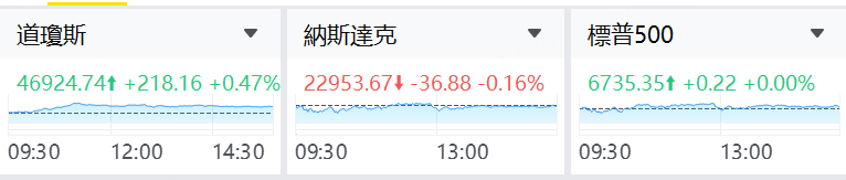 截至收盤,道瓊斯指數漲0.47%,報46,924.74點;標普500指數平收,報6,735.35點;納斯達克指數跌0.16%,報22,953.67點。
