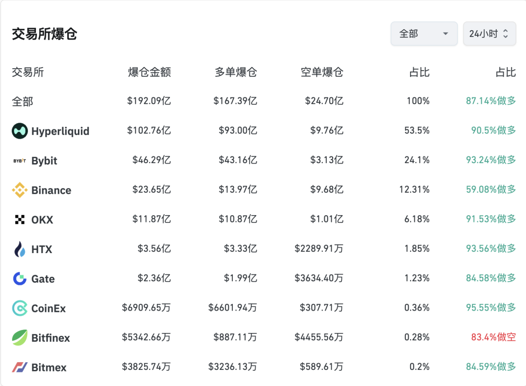 Coinglass 數據顯示,截至 11 日 9 時,24 小時爆倉額達到 192 億美元,爆倉人數達 164 萬人,最大單筆爆倉單超 2 億美元。