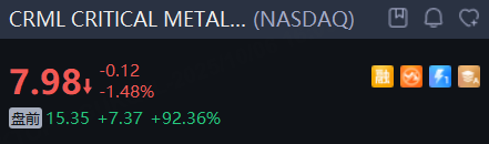 週一, CRITICAL METALS CORPORATION 盤前飆升超90%!消息稱特朗普政府計劃入股該公司,以便控制稀土資源。同時,相關概念股盤前普漲,截至發稿,American Resources漲超14%,NioCorp Developments漲超9%,USA Rare Earth、Energy Fuels漲約5%。