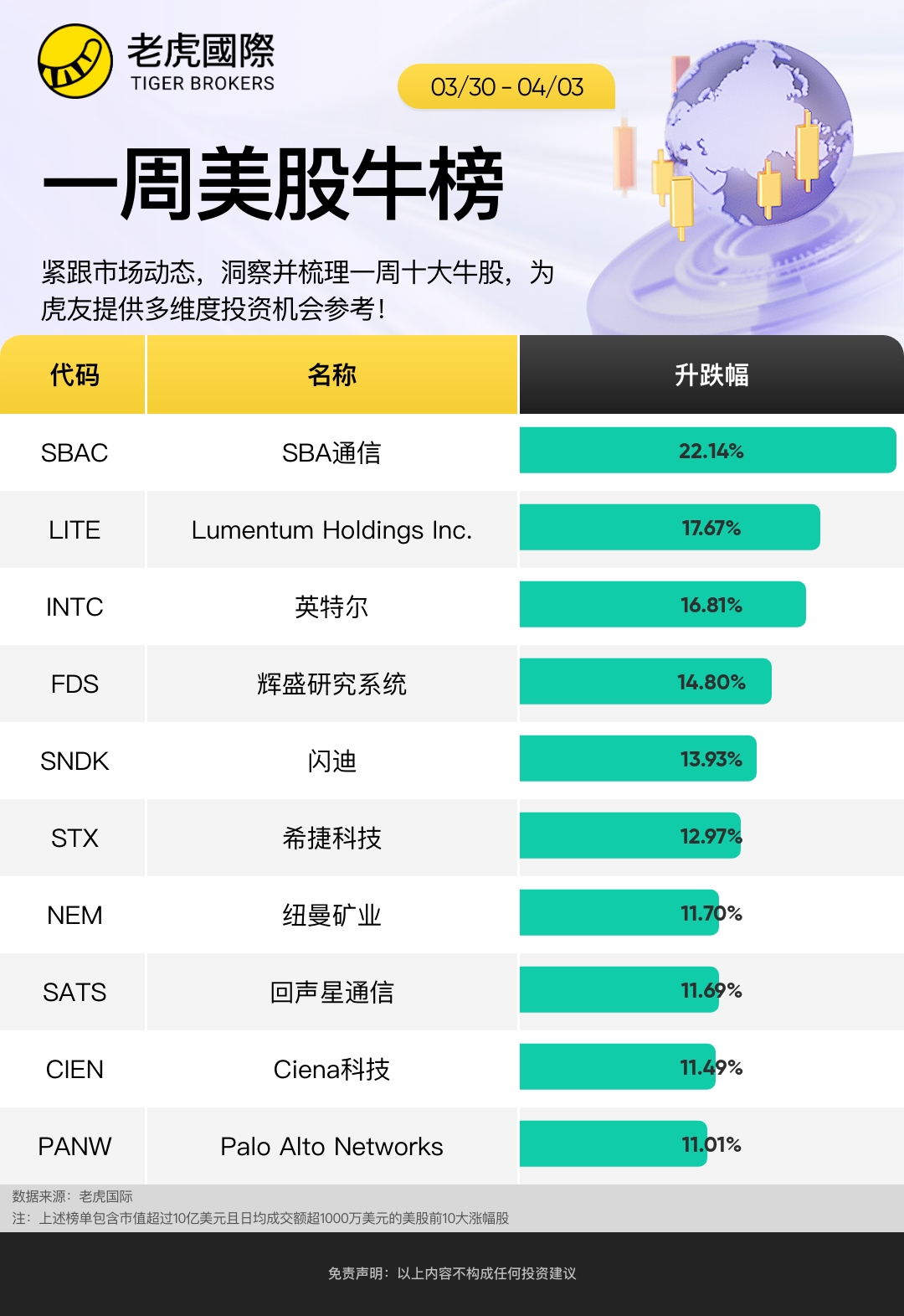 上周哪些股票表現優異?以下為截至4月3日當周 S&P 500 成分股漲幅前十名單: