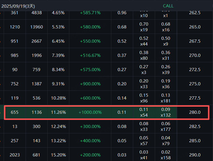 被強勁行情帶動,谷歌CALL的成交價格批量飆升,一份本週五到期的認購合約,行權價280美元,成交價飆升1000%。