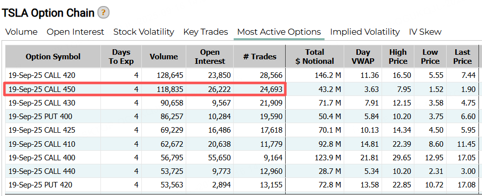 特斯拉的活躍期權中,排名前三的均為認購合約,其中一份本週五到期的CALL行權價達450美元,較現價有約10%的漲幅空間。