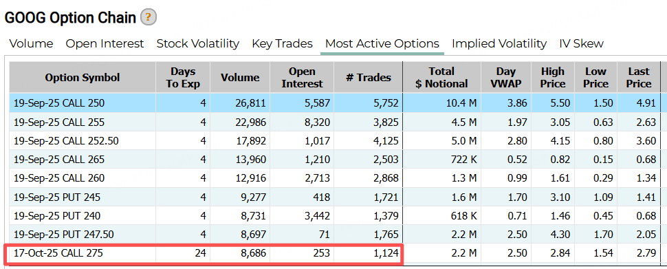 排名前列的活躍期權中CALL佔比略高,一份10月17日到期的合約,行權價達275美元,漲幅空間近10%。