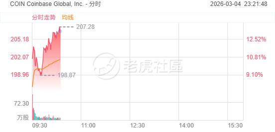 3月4日,美股加密貨幣概念股漲幅持續擴大,Coinbase升逾13%,Strategy、Hut 8升逾10%,Robinhood升逾9%,BitMine、Riot Platforms升逾7%。