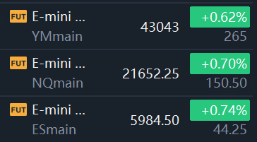 At 7:50 a.m. ET, Dow e-minis were up 265 points, or 0.62%, S&P 500 E-minis were up 44.25 points, or 0.74%, and Nasdaq 100 E-minis were up 150.5 points, or 0.7%.