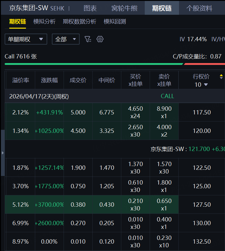 期權方面,京東認購合約的漲幅更是誇張,一張周五到期,行權價127.5港元的CALL,價格狂飆3700%!