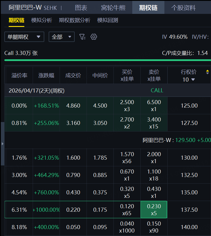 期權方面,阿里巴巴周內到期的認購合約價格大漲,一張行權價137.5港元的CALL飆升1000%。