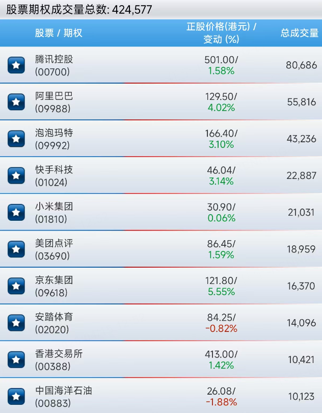 港股股票期權上午成交424577張合約。騰訊、阿里巴巴、泡泡瑪特位居個股期權成交的前三位。