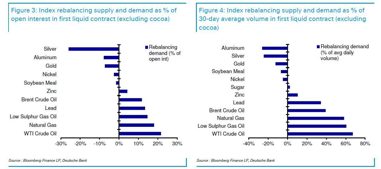 德意志銀行分析師Michael Hsueh指出,「對貴金屬不利,對原油有利」。按未平倉合約規模計算,白銀將承受最大的再平衡拋售壓力,其次是鋁和黃金。買入需求為WTI原油、天然氣和低硫柴油。