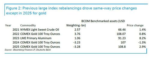 他回顧了過去五年的指數再平衡事件,發現2021-2024年間,重大權重變化與價格走勢方向一致,但2025年黃金權重下調卻伴隨着金價上漲。