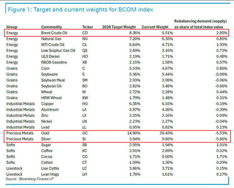據彭博數據,此次再平衡將黃金權重從20.4%下調至14.9%,白銀也面臨權重削減,權重將從9.6%降至3.94%,再平衡期將從1月8日盤後開始,並持續至14日(再平衡執行日期1月9日-15日)。