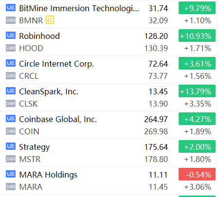 11月28日,美股夜盤時段,加密貨幣概念股上漲,CleanSpark, Inc.、MARA Holdings漲超3%,BitMine、Robinhood、Coinbase、Strategy漲超1%。