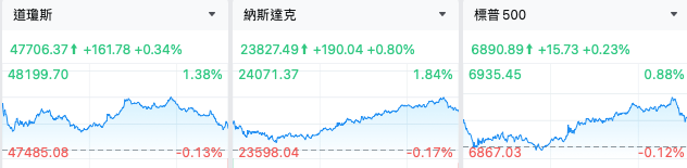 週二,美股三大指數集體上漲,收盤均刷新歷史新高。截至收盤,道瓊斯指數漲0.34%,報47706.37點;標普500指數漲0.23%,報6890.89點;納斯達克綜合指數漲0.8%,報23827.49點,均刷新了週一錄得的歷史紀錄。