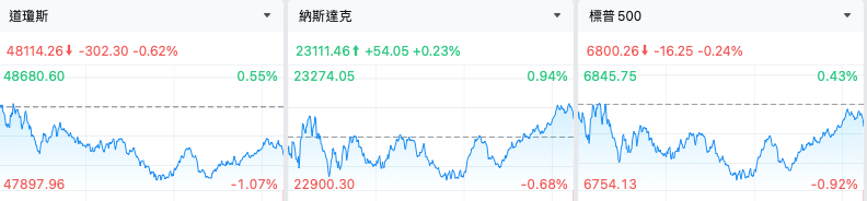 美東時間週二,美股三大指數升跌不一。截至收盤,道瓊斯指數跌0.62%,報48,114.26點;標普500指數跌0.24%,報6,800.26點;納斯達克指數漲0.23%,報23,111.46點。