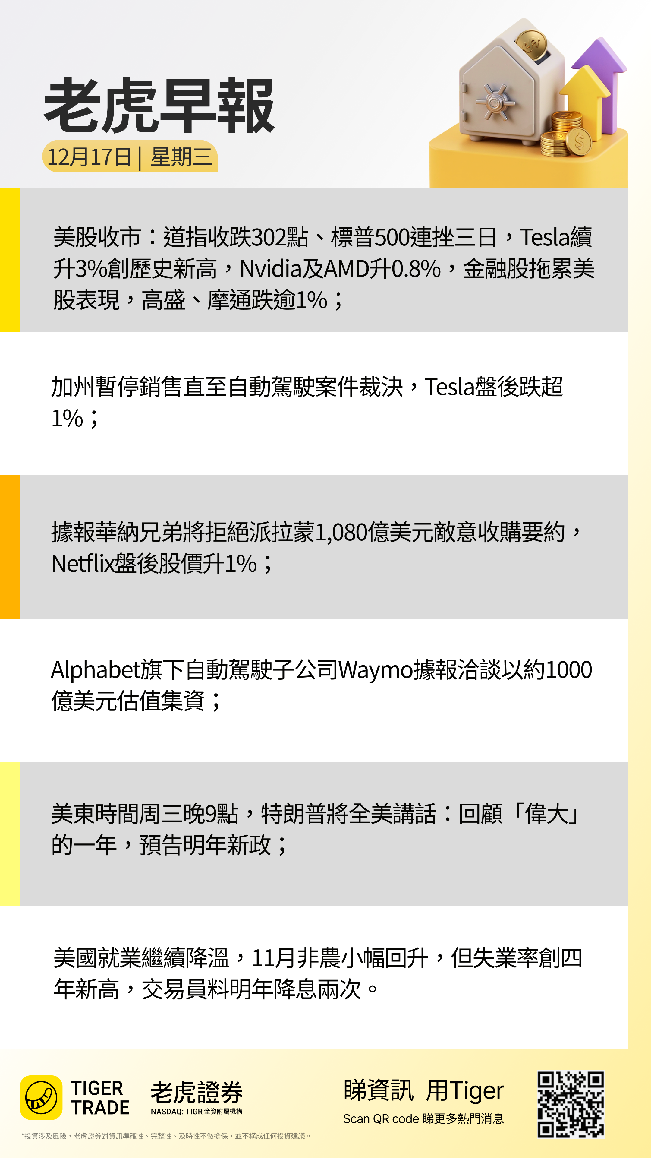 美股收盤|三大指數升跌不一,特斯拉漲超3%創歷史新高!加密貨幣概念股回升,Circle漲約10%