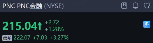 PNC金融 升逾3%,四季度每股收益4.88美元,超出預期,按年增長29.44%。