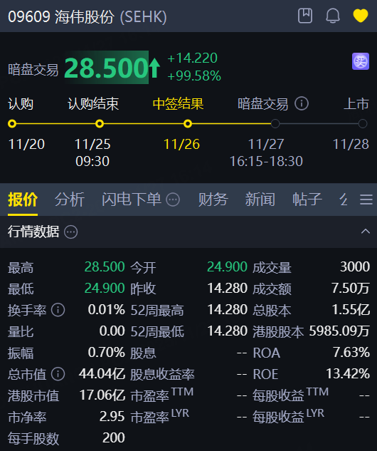 11月27日,海偉股份暗盤漲近100%,總市值超44億港元;公司每股定價14.28港元,每手200股,將於11月28日(週五)正式掛牌交易。