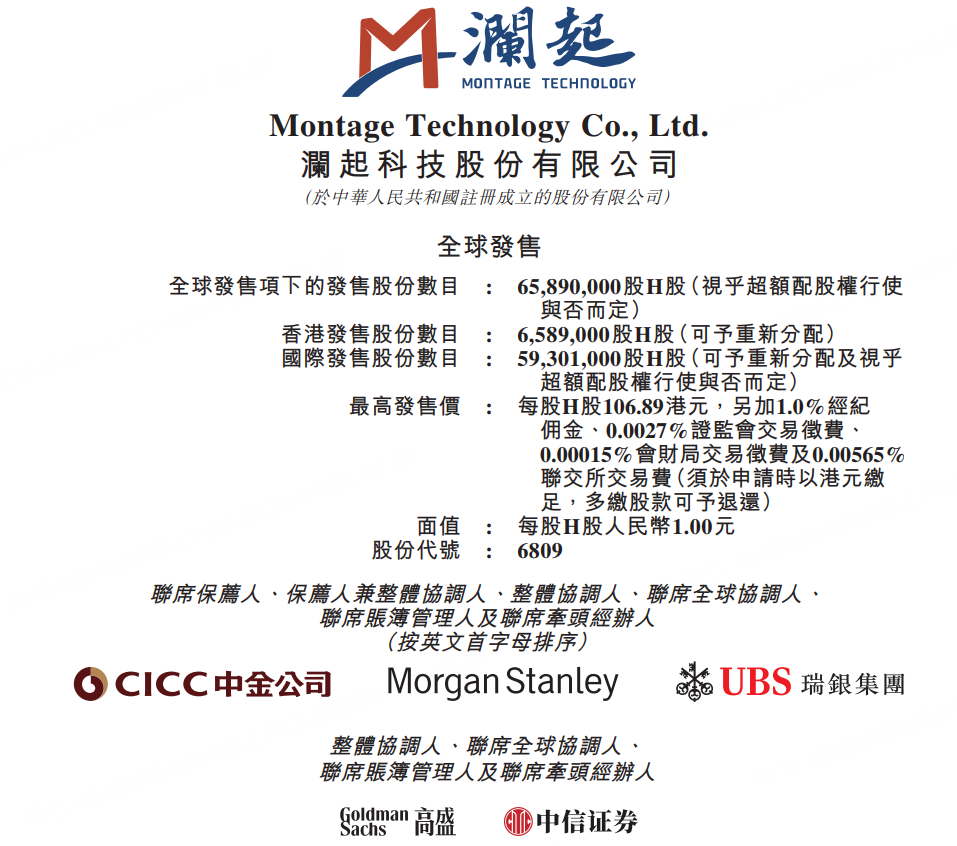1月30日,瀾起科技發布公告,於1月30日至2月4日招股,公司擬全球發售6589萬股,每股發售價不高於106.89港元,每手100股,入場費10796.8港元,中金公司、摩根士丹利及瑞銀集團為聯席保薦人,預計將於2月9日開始在港交所掛牌交易。