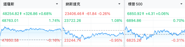 截至收盤,道指漲326.86點,漲幅為0.68%,報48254.82點;納指跌61.84點,跌幅為0.26%,報23406.46點;標普500指數漲4.38點,漲幅為0.06%,報6850.99點。