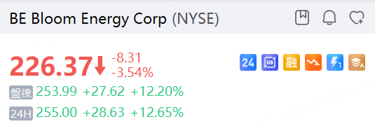 Bloom Energy股價在周二常規交易時段下跌3.5%至226.37美元后,於盤後交易中大漲12%。今年迄今為止,該股已飆升161%,投資者將Bloom的固體氧化物燃料電池視為滿足AI數據中心激增能源需求的強大電力來源。