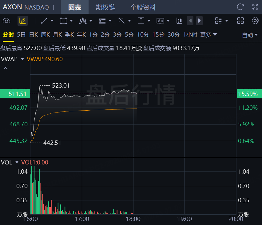 2月25日,Axon Enterprise盤後飆升逾15%!第四季度業績超出華爾街預期,並提供了樂觀的業績指引,投資者對這家公共安全技術公司的強勁勢頭反應積極。