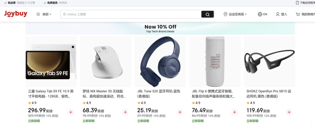 目前,Joybuy正面向新用戶開啓優惠活動,包括並不限於:前三個訂單免運費、可樂、芬達等部分產品折扣價。首頁還顯示,4月7日至4月30日,包括三星、羅技、韶音在內的部分科技品牌產品可享九折優惠。