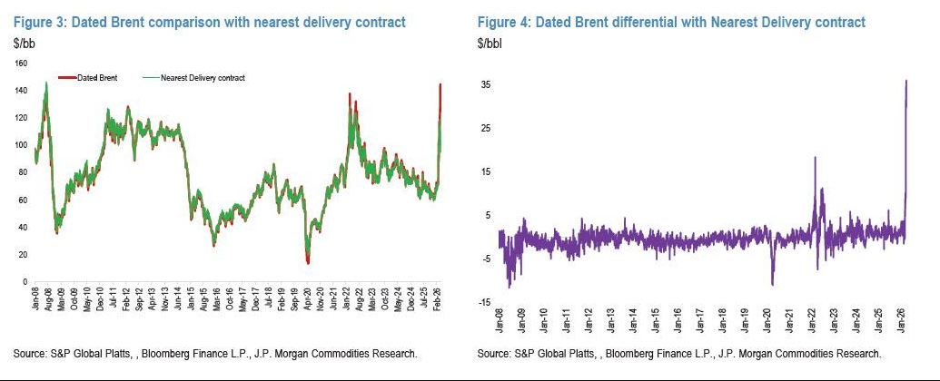 然而4月7日,現貨布倫特報價達到每桶144美元,而6月交割的期貨合約僅報約109美元,兩者價差超過35美元,遠超歷史常態。摩根大通指出,這一異常價差表明,市場在尋求即期實物交割方面已陷入困境,即便市場仍預期供應最終將恢復正常。