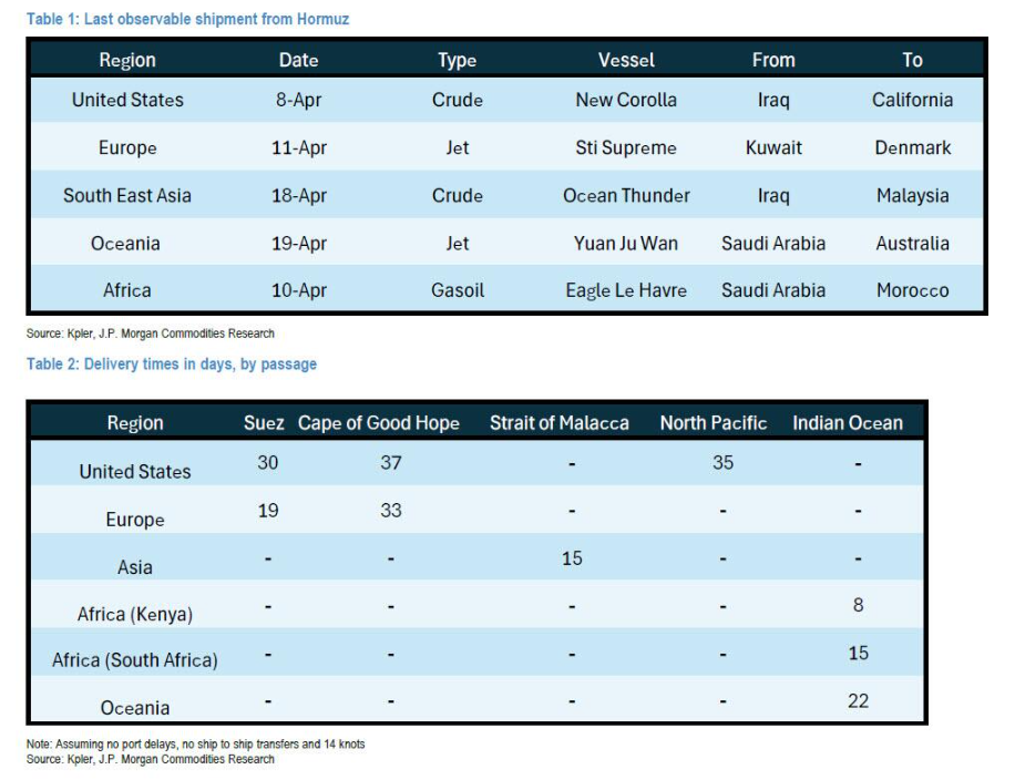 據摩根大通測算,霍爾木茲海峽封鎖前最後一艘通過的油輪於2月28日離港,預計將於4月20日前後抵達目的地。這一時間節點標誌着全球供應鏈中封鎖前原油的徹底清零,重新開放海峽已成為市場當前最緊迫的優先事項。