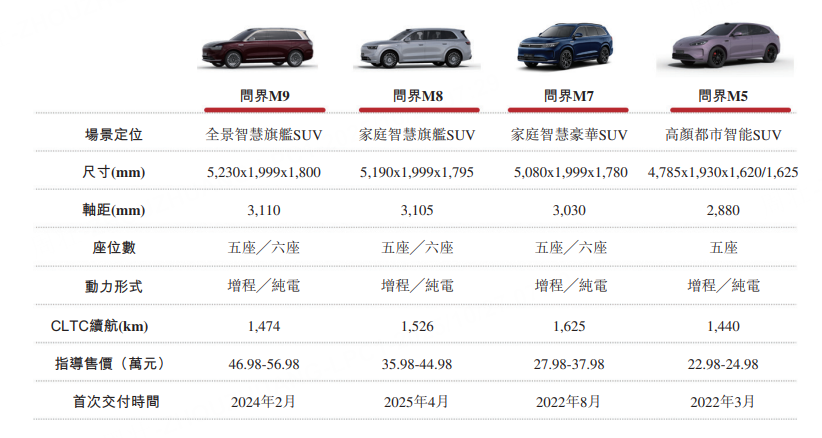 該公司的問界品牌已形成包括問界M9、問界M8、問界M7和問界M5四款車型的產品矩陣,通過差異化定位實現市場覆蓋,以精準價格梯度與場景化功能組合,全面搶佔高端用戶市場。